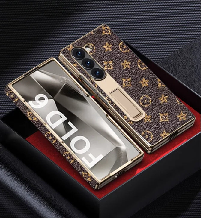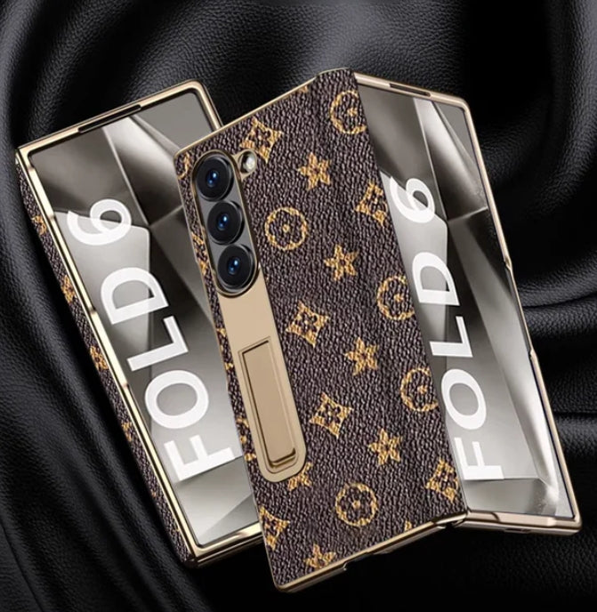 Samsung Z Fold3/4/5/6用高級ゴールド電気メッキプレミアムレザーカバー